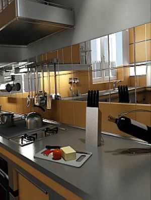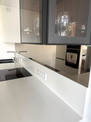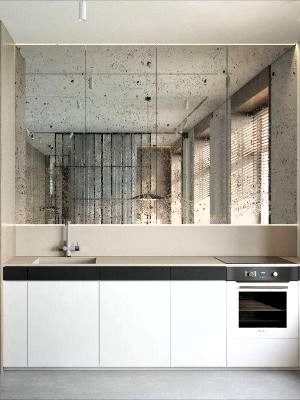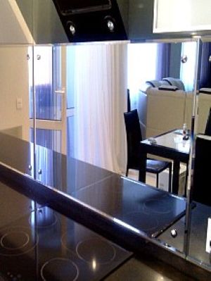 В зеркальном, так-же как и в стеклянном фартуке по запросу клиента делаются отверстия и вырезы. Зеркальное полотно не имеет пор, поэтому в него не въедается грязь, гарь, влага и запахи. Не служит питательной средой для грибков и плесени. Легко очищается любыми средствами для стекла.