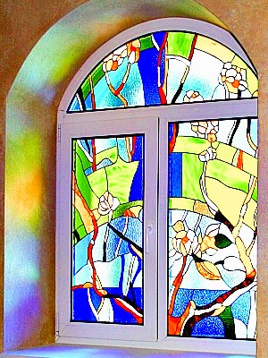 - Пленочный витраж. Доступное и быстрое решение для имитации витража, идеально подходящее для нестандартных форм и больших площадей.