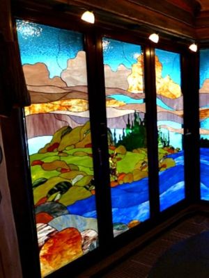 - Заливные витражи. Имитация витража с помощью полимерных красок. Отличный вариант для создания витражных эффектов на больших площадях по более доступной цене.