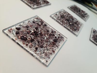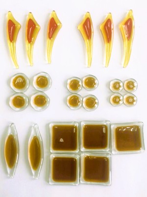 Для изготовления фьзинга используют специальные витражные стекла для спекания, вырезанные в ручную. Цвет и размер фьюзинга подбирается по утвержденному ранее эскизу. Каждый из фрагментов обрабатывается и укладывается в композицию. После чего помещается в специальную печь для плавления, благодаря чему превращаясь в единое целое.